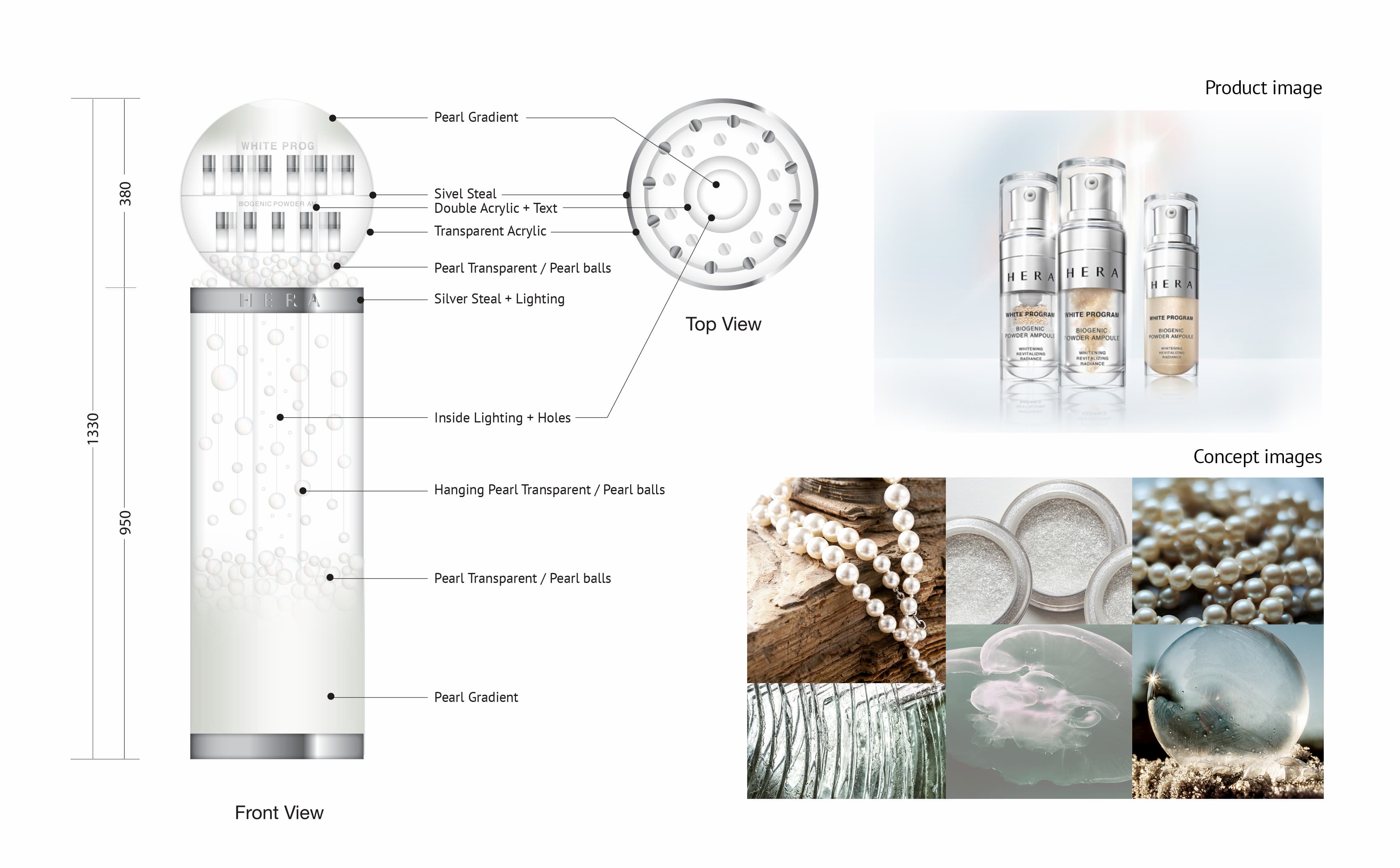 This is a whitening ampoule which is a separated transparent ampoule and vitamin C granules. When you push the button, two different materials are mixed. I designed VMD for this product and express the moment when the powder activates into the ampoule. I focused on pearl granules and brightening effects. It should be elegant and luxurious but not too complicated in a department store.