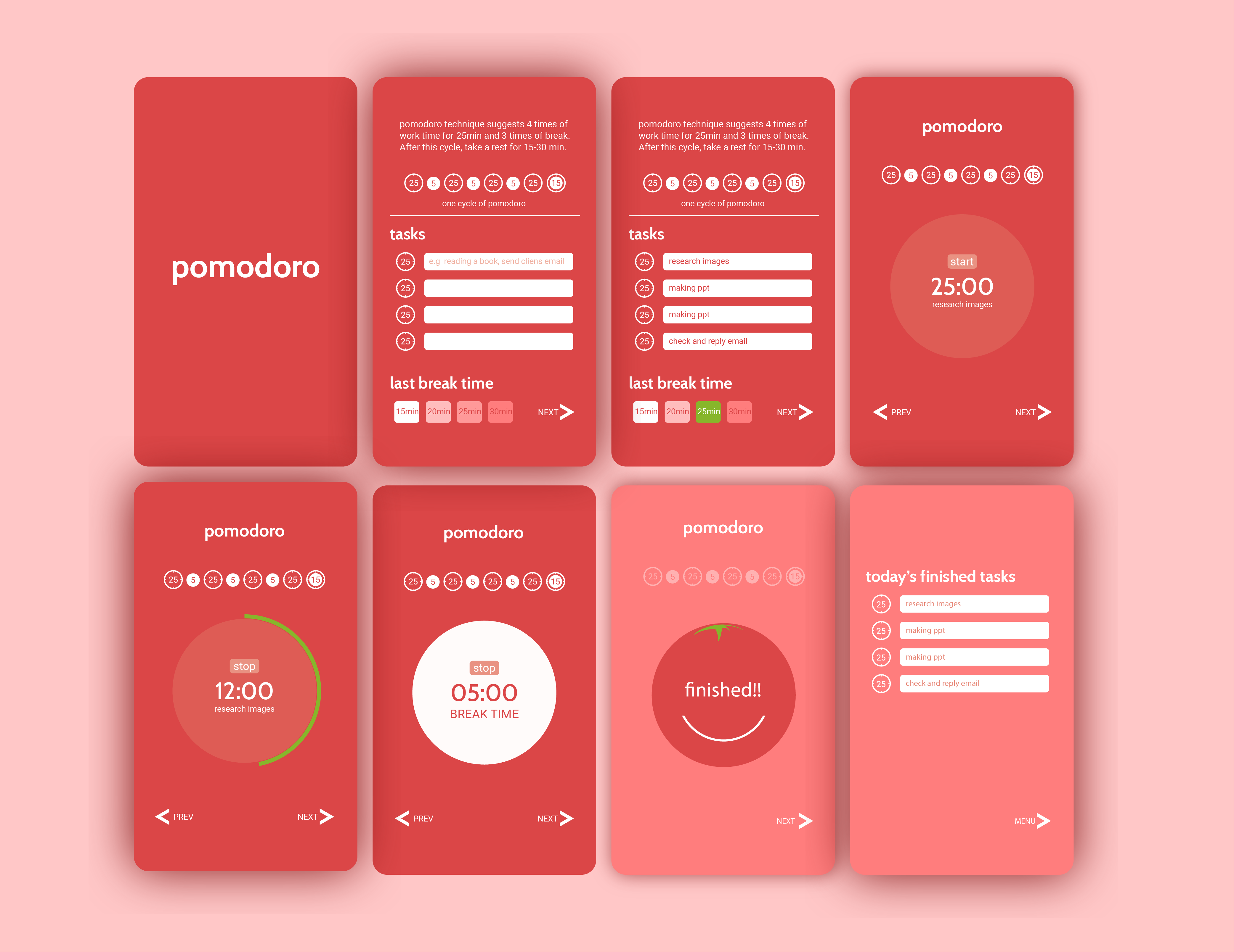 I designed an application of the pomodoro technique. The pomodoro technique is a way to manage your time created by Francesco Cirillo. It is named after the Italian word for tomato since the timer used by the technique’s creator was shaped as a tomato. Plan your list of work and pick a tack. Set the timer to 25 minutes and get to work without any distractions. Stop focusing on your work, when tims up. Take a five minutes break. And then, get back to work like repeating previous steps. After the fourth pomodoro, take a longer break. It makes you spend your time productively.